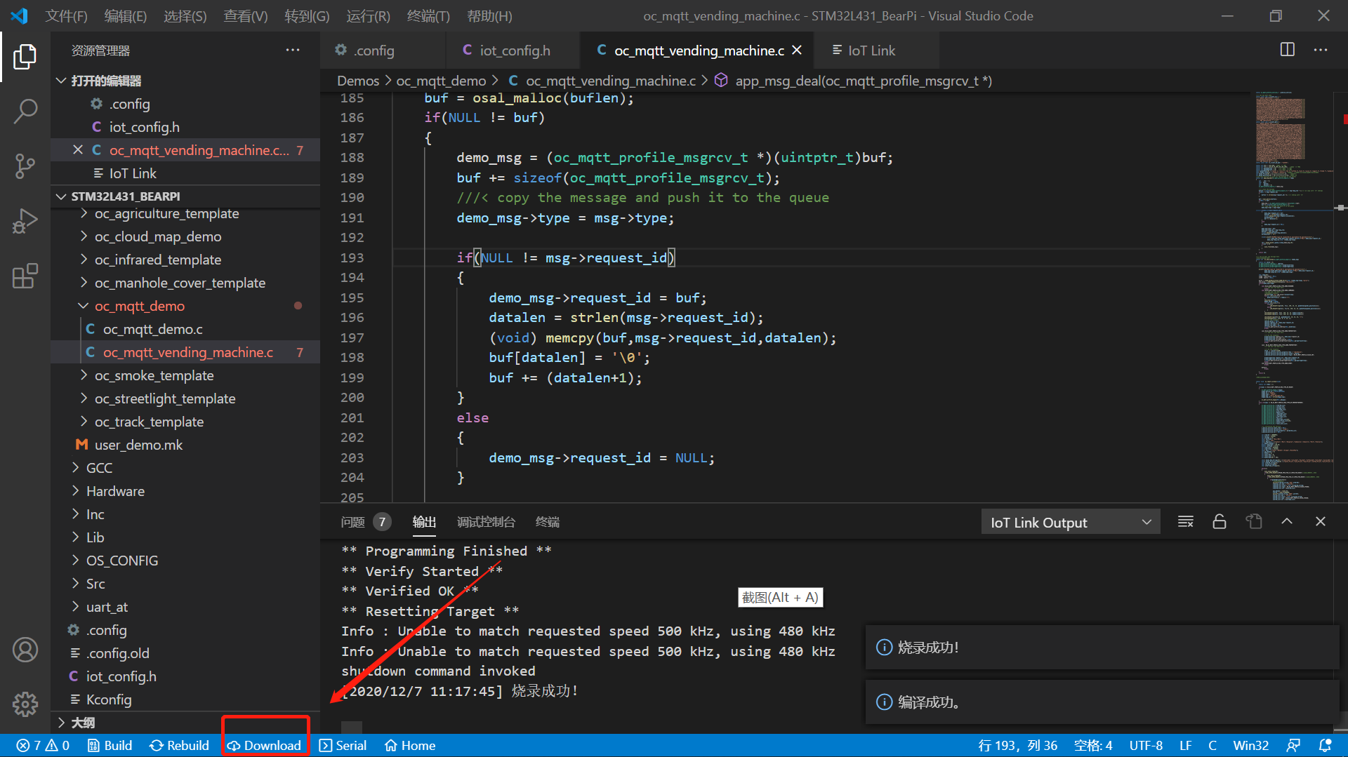 连接好小熊派开发板,把AT开关拨到MCU端,点击Download。如下图所示: