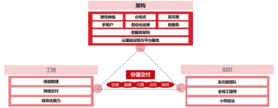 以业务的价值交付为中心,达到快速与高效的交付价值,并且在规模化扩展的同时,兼顾可靠性、灵活性等。