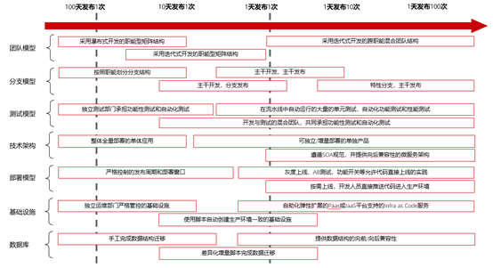 云原生架构下DevOps的落地与转型,是一个量变到质变的过程,需要从团队模型、分支模型、测试模型、技术架构、部署模型、基础设施、数据库模型等七大领域进行相应的匹配,持续优化交付粒度,加快交付速度,提升交付质量。以发布频度为抓手,从100天发布一次,逐步的十倍速增长,到10天发布一次。在这两个阶段点,从七个维度来看,需要匹配与采纳的实践是什么。