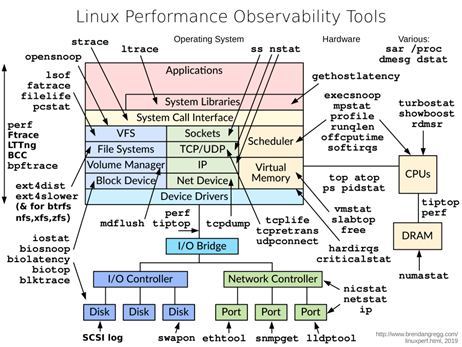 一个更细致的观察方法就是通过内核ftrace、perf-event来动态观测Linux内核。比如记录写块设备的起始和返回时间,这样我们就可以知道磁盘写是否有延时,也可以统计写磁盘时间耗费分布。有一个开源的工具包perf-tools里面包含着iolatency, iosnoop等工具。