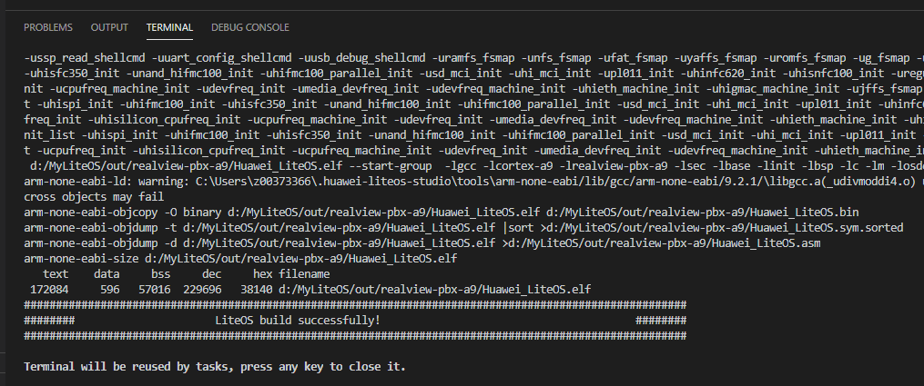 对于真实开发板,需要把镜像bin或者hex文件烧录到开发板,才能运行。使用Qemu模拟器好处是并不需要真实烧录,启动Qemu传入镜像参数即可。我们复用烧录功能,点击工具栏上的图标进行烧录,启动Qemu模拟器运行编译的LiteOS工程。