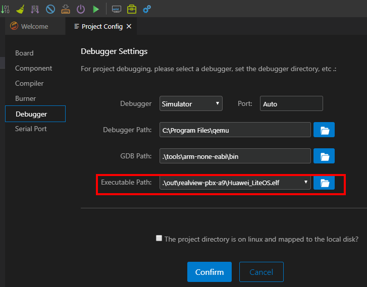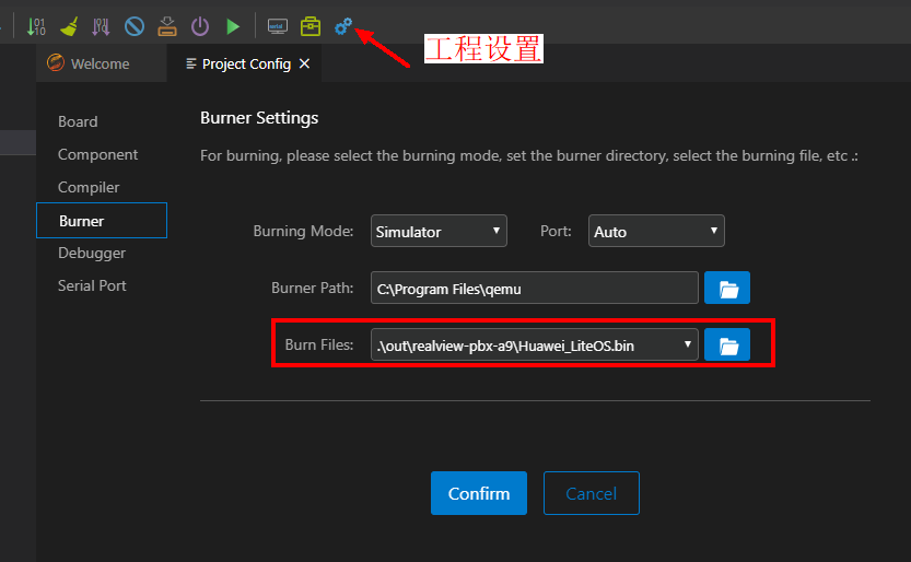 在编译完毕,打开工程设置,在烧录器Burner和调测器Debugger设置里,分别设置需要烧录的bin文件和调测使用的elf可执行文件,分别如下图: