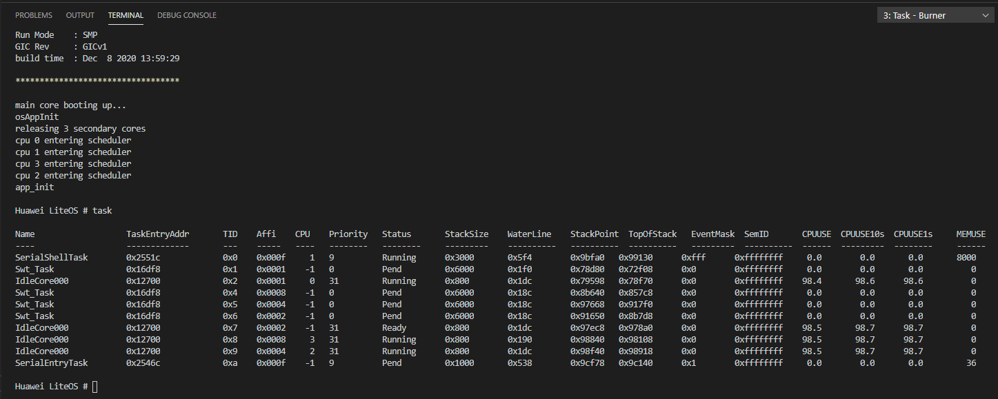 默认的配置时,输出启动信息后,就进入shell模式,我们可以输入task,查看运行中的任务的信息。更多LiteOS shell命令,请参考 https://gitee.com/LiteOS/LiteOS/tree/master/shell 。Shell命令输出示例如下: