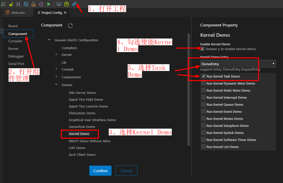 LiteOS是高度可配置的系统,除了默认设置,我们可以在工程设置--组件管理中对系统组件配置进行定制。这里演示下如何开启Kernel Demo在Qemu模拟器上运行。