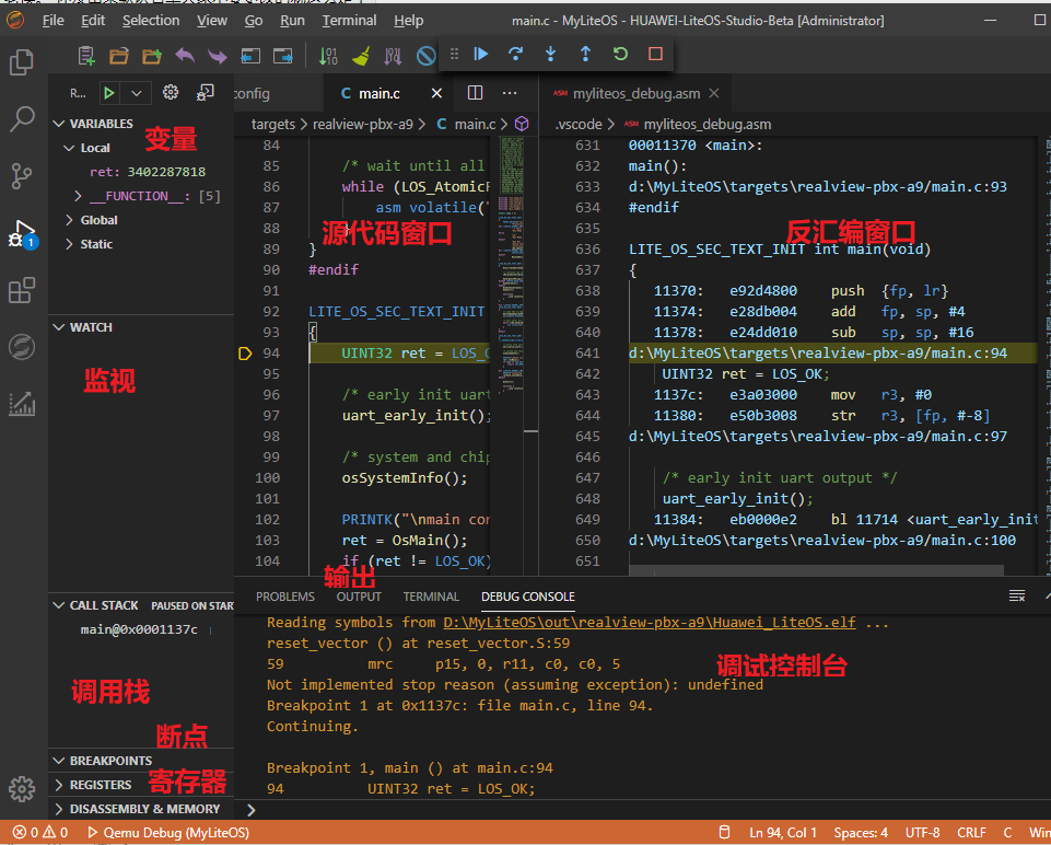HUAWEI LiteOS Studio 调测非常简单易用,点击工具栏上的调测按钮即可开启GDB图形化调测。对于我们的Qemu工程,开始调测后的界面如下:
