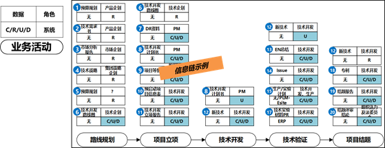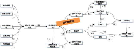 站在纯粹数据的视角,可以基于业务场景的信息链进一步抽象出数据之间的演进关系,明确建立数据之间关系的规则。对于企业业务信息模型(EBIM)来说,其目的是要构建有关业务场景完整的概念数据模型,这些模型应该包含相关的数据业务对象及其之间的关系。业务对象之间的关系是通过业务场景中的业务活动逐步演进出来的,例如由技术开发路线规划演进出技术开发项目立项,很显然这两者之间是存在联系的,而这些业务联系最终都会体现在数据建模上,以保证数据记录与业务实际情况的高度一致。