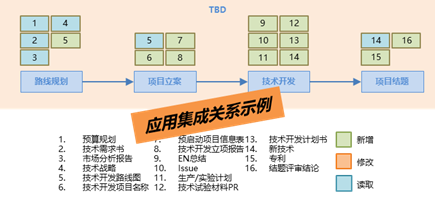 站在纯粹应用的视角,可以将信息链中各业务活动涉及的应用系统进行关联,描绘各应用之间的数据集成关系。对于应用集成关系来说,其目的是要构建有关业务场景完整的应用集成视图,发现应用集成的相关问题,包括但不限于不必要或不合理的应用集成、待构建的应用集成、未坚持数据同源原则的应用集成等。以下是应用集成关系视图的示例,其中对每个应用中对相关数据的操作按照CRU进行了区分识别。