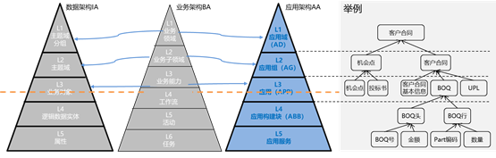 其中,L1和L2的流程域、主题域和应用域均为业务管理的划分,建议按照客户实际的业务管理方式统一划分标准,横向对齐。L3是架构规划的最小颗粒度,在流程域、主题域和应用域中应保证流程、业务对象和应用的粒度一致。L4和L5是方案设计阶段需要输出的交付件,一般较难保证流程要素、数据要素和应用要素的粒度一致性,可以允许多对多的关系。