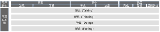 如果将用户要做的工作按照三大阶段七个步骤、四个同理心层次进行交叉分析,我们就能得到一张针对用户活动的专业评估表格,就能对用户活动进行全面的洞察和理解。