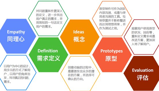 设计思维“Design Thinking”是“以人为本”解决问题的方法论,从用户需求性、商业延续性、技术可行性角度进行思考,寻求创新解决方案,解决用户实际问题。Design Thinking方法可以分成5个阶段:同理心、需求定义、概念、原型和评估,如下图所示。