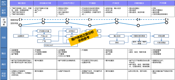 在面向客户的时候,我们在业务端到端协同场景剖析过程中识别的业务活动可以视作“服务组织+与服务对象接触的员工或IT系统”组织的服务活动,这些服务活动需要客户通过服务触点参与进来并进行交互,因此,接下来的任务就是站在客户视角识别客户与端到端业务协同场景下业务活动的交互触点。如下图所示,用户体验之旅(Journey Map)是用户触点分析的一个很好的工具。