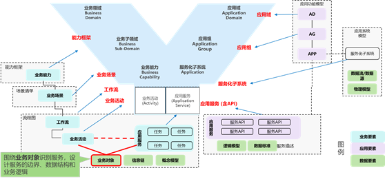 面向用户的服务触点/业务活动需要“服务组织+与服务对象接触的员工或IT系统”的支撑,这个支撑的本质就是必须的业务应用服务(业务应用服务可以是个IT化的概念,也可以是个非IT化的概念,无论有没有IT化,终归都是可以作为服务化IT架构中应用服务的需求)。用户服务触点/业务活动和业务应用服务的关系可以参考华为公司服务化IT架构的元模型 – V模型