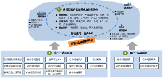 最后,基于用户交互触点、需要调用的业务应用服务和数据服务,可以组合成面向用户的一站式APP(轻应用),以完成前台应用规划。下图是面向客户的前台应用规划示例,可以将面向客户的交互活动划分为一站式交易、一站式服务、客户360地图三个前台APP