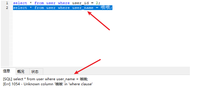 【摘要】 - 今天在dubug代码时发现的一个问题- 数据库中有两个字段 `user_id` `user_name`,两个都是 `varchar` 类型,不过 `user_id`中存放的是数字串,`uaer_name` 中存放的是汉字- 然后进行查询操作 ,发现查询 `user_id` 时不加引号也可以,这。。。