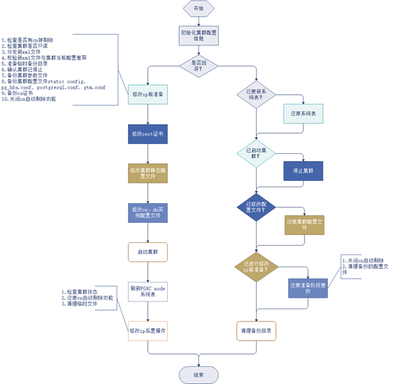- 首先进行修改IP前置准备,包括检查环境,导出当前IP配置信息,停止集群