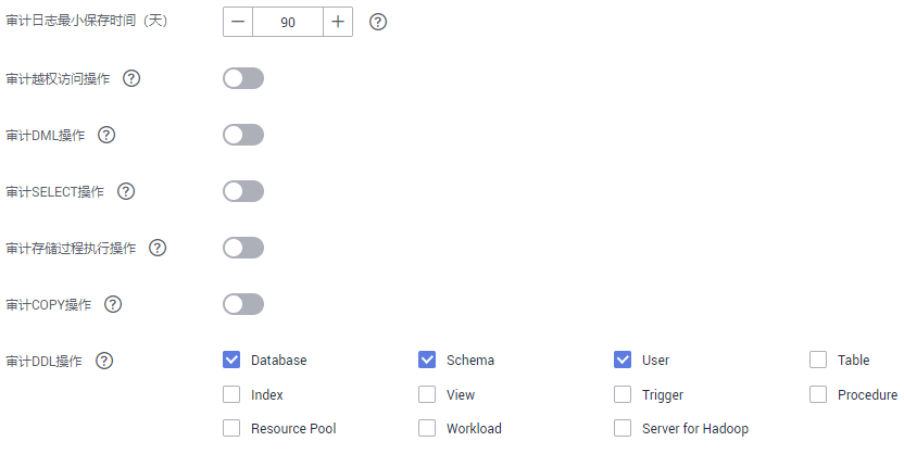 表示是否对指定数据库对象的CREATE、DROP和ALTER操作进行记录。除“Database”、“Schema”和“User”默认启用记录,其他默认关闭。 |