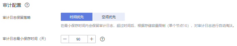 设置审计日志保留策略,支持如下两种策略: o “空间优先”:表示当单个节点的审计日志超过1G后,将自动淘汰审计日志。 o “时间优先”:表示在“审计日志最小保存时间(天)”内会保留审计日志,超过时间后,根据存储容量限制(单个节点1G),对审计日志进行自动淘汰。 默认策略是“空间优先”。 说明: 版本号为1.0.0和1.1.0的集群不支持设置审计日志保留策略。 |