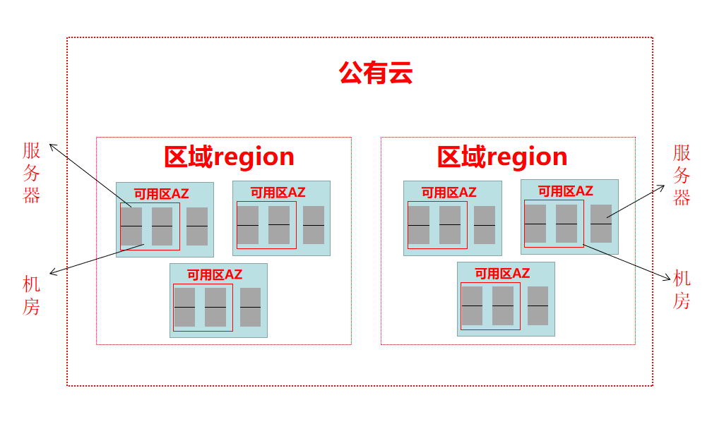 我们来开上面的图,公有云的云资源分为区域region,比如华北-北京一就是一个区域region,华北-北京四是另一个区域region。