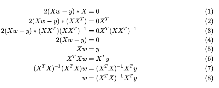 注:式(1)到式(2)推导过程中, X是一个m行n列的矩阵,并不能保证其有逆矩阵,但是右乘XT把其变成一个方阵,保证其有逆矩阵。