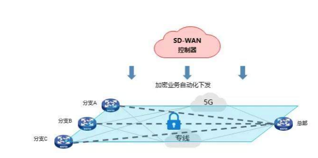 在5G网络之上,构建Overlay网络,通过SD-WAN方案对网络SLA实时监控,为业务流量制定最优路径。