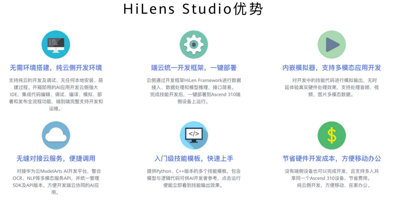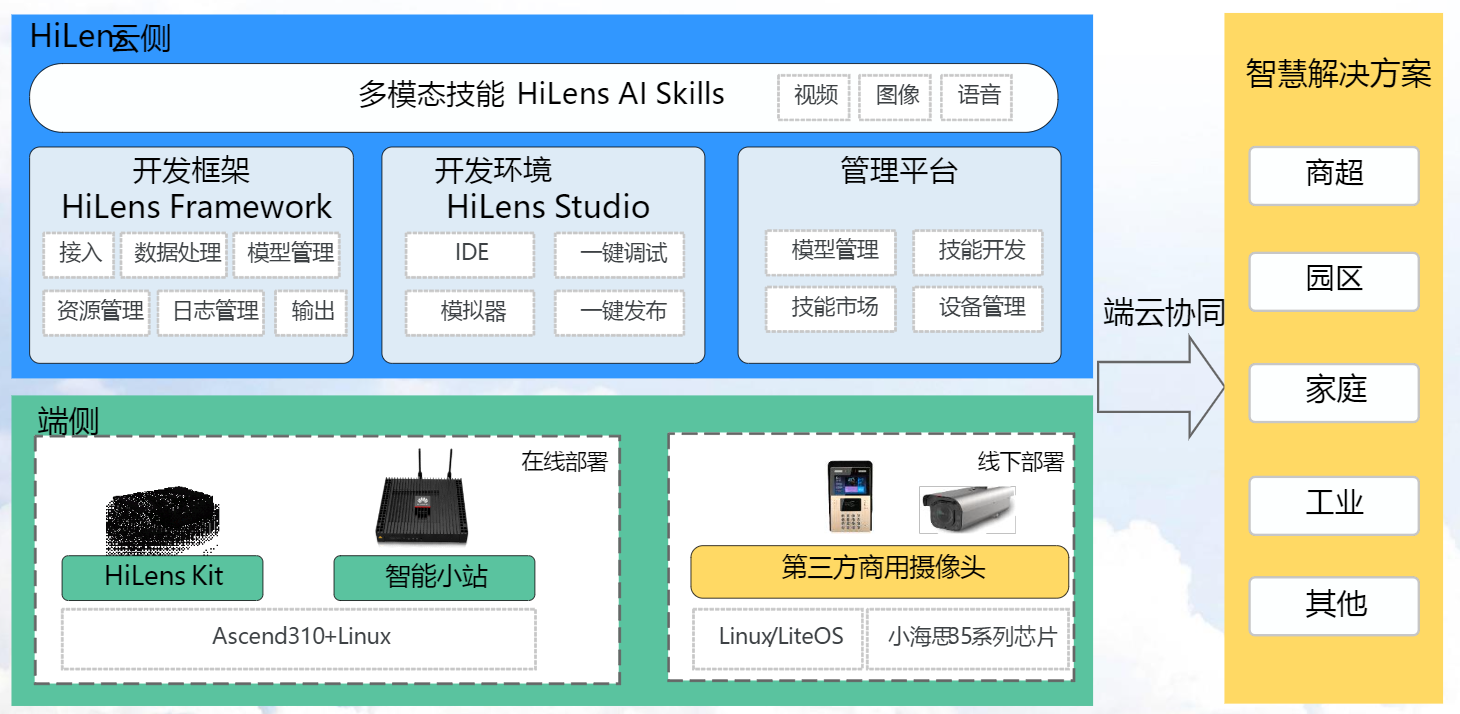 华为HiLens为端云协同多模态AI开发应用平台,由端侧计算设备和云上平台组成,提供开发框架、开发环境、管理平台等能力,帮助用户开发多模态AI应用并下发到端侧设备,实现多场景的智能化解决方案。
