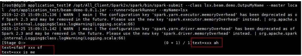 /opt/All_Client/Spark2x/spark/bin/spark-submit --class lsx.beam.demo.OutpuMyName --master local /opt/application_test/beam-demo-0.0.1.jar --runner=SparkRunner --myName=lsx