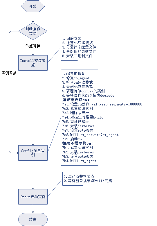 1.节点修复和实例修复共用gs_replace流程,差别在于节点修复需完整执行install+config+start三阶段,实例修复仅需要执行config+start两阶段;