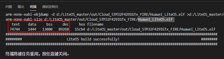 终端控制台输出显示编译成功了,可执行文件Huawei_LiteOS.elf对应的text段为74774 bytes,data段大小1444 bytes,bss段13080 bytes,dec表示前面三段大小的合计,为89268bytes。这些text、data、bss数据代表什么?有什么意义?我们继续,后文中会详细解释。