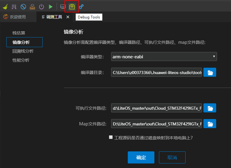 点击LiteOS Studio工具栏的调测工具Debug Tools按钮,打开调试工具,选择镜像分析,这就是本文要给大家介绍的LiteOS Studio的镜像分析工具。填写可执行文件路径、Map文件路径等,如图: