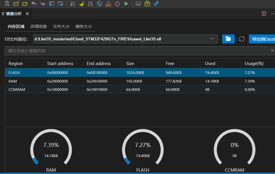 内存区域页面评估分析LiteOS开发板工程对内存的细分使用情况。对于STM32F429IGTx开发板,显示的内存区域region包含FLASH、RAM、CCMRAM,展示的信息包含每个内存区域的名称、起始内存地址、总大小、空闲大小、已用大小,使用比例。在这个内存区域页面,除了数值展示分析,还提供饼图可以宏观的评估每个区域的使用、剩余情况。如下图所示,FLASH总大小 1024Kb,RAM总大小192Kb,对FLASH、RAM的使用率较低,刚刚超7%。对于CCMRAM更是没有使用,CCM(Core Coupled Memory)是给STM32F4内核专用的全速64KB RAM。