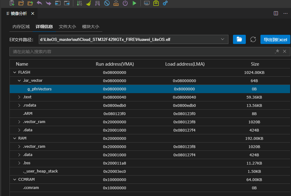 继续点击详细信息选项卡打开镜像分析详细信息页面,该页面展示每个内存区域包含的内存段section,内存段包含的符号symbol的详细信息。 比如FLASH下面包含.isr_vector、.text、.rodata等内存段, 内存段又包含分配在该段的程序符号。每一行展示的信息包含运行地址VMA(Virtual Memory Address)、装载地址LMA(Load Memory Address)、内存段/符号的大小。其中,LMA表示程序装载的内存地址;VMA表示程序运行时的内存地址。嵌入式系统中RAM内存空间有限,一般把程序放在FLASH中,LMA地址为Flash中的地址,等到程序运行时,再载入到RAM中的运行地址VMA。内存段.data、.vector_ram就属于这种情况,VMA、LMA地址不一样,并且在FLASH、RAM均出现。