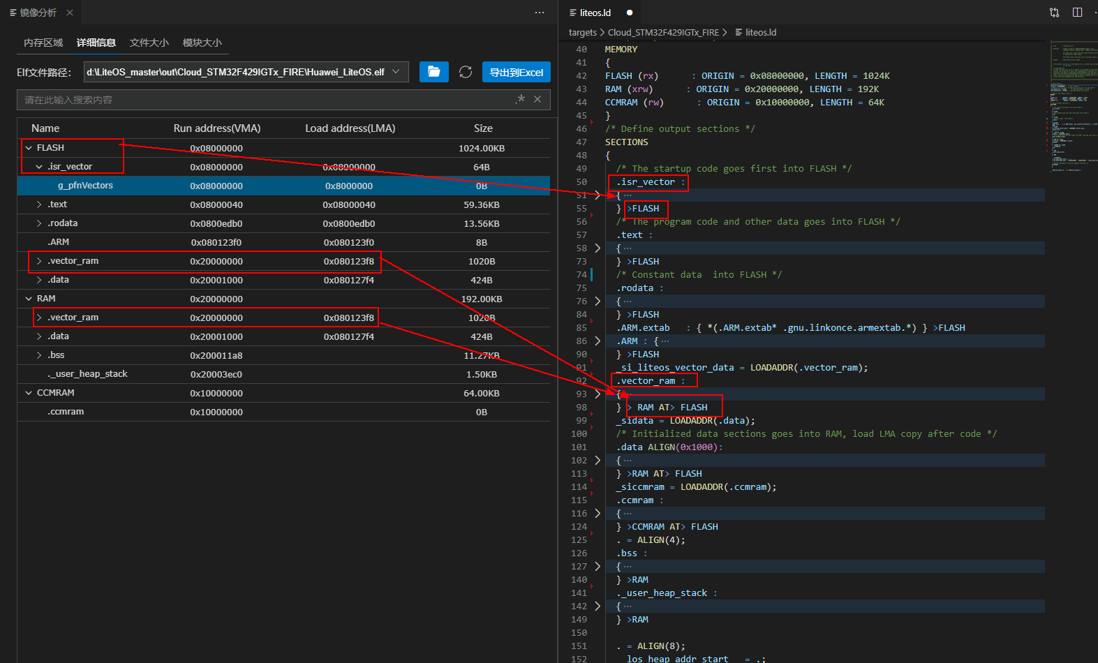 链接脚本包含一些规则来约束链接器如何把函数、变量放到ROM或RAM,STM32F429IGTx工程的链接脚本位置在targets\Cloud_STM32F429IGTx_FIRE\liteos.ld。我们分栏同时展示镜像分析页面和链接脚本,如下图,可以看出镜像分析页面展示的内存段使用情况和链接脚本中所定义的是一致的,开发板的内存使用情况在LiteOS Studio 镜像分析页面得到非常直观的展示。