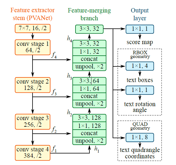 EAST网络是一个全卷积网络,主要有三部分:特征提取层,特征融合层,输出层。由于在一张图片中,各个文字大小不一,所以需要融合不同层次的特征图,小文字的预测需要用到底层的语义信息,大文字的预测要用到高层的语义信息。EAST网络结构图参考下图