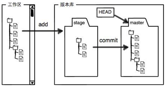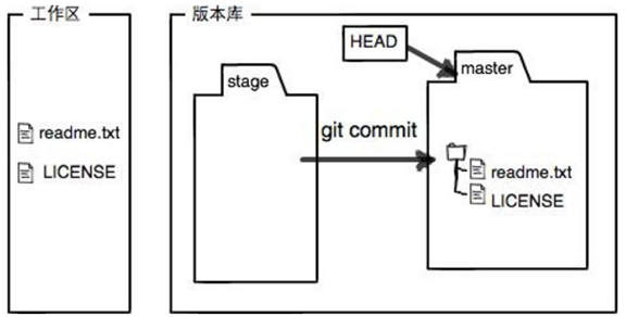 在windows中能看到的目录和文件都是属于工作区,被隐藏的.git目录是版本库,版本库中又分暂存区(stage)和分支(图中为master)