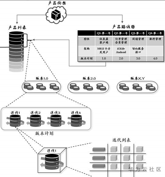 开始时必须产生一些最基本的需求来填充产品列表,在确立列表之后,建立一个产品路线图。路线图要有时间轴、版本号和对应的特性功能信息。路线图可以表示产品随着时间的推移如何以增量方式构建和交付,以及驱动每一个版本的重要因素。