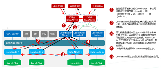 下图是应用访问GaussDB(DWS)的业务流程架构图,对于业务应用或者用户来说,他们发生请求给CN,CN解析并生成执行计划,交给DN去执行,执行后再由CN汇总将数据返回给业务用户或者业务应用。这个过程是容易理解的,本次我们重点关注的是站在CN前面的LVS+KeepAlived。