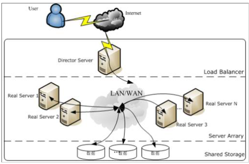 - Server Array层:由一组实际运行应用服务的机器组成,Real Server可以是WEB服务器、MAIL服务器、FTP服务器、DNS服务器、视频服务器中的一个或者多个,每个Real Server之间通过高速的LAN或分布在各地的WAN相连接。在实际的应用中,Director Server也可以同时兼任Real Server的角色。