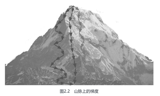 梯度下降(Gradient Descent)算法是一个一阶最优化算法,通常也称为最速下降算法。为了找到一个损失函数(或目标函数)的局部最小值,必须向函数前点对应梯度(或者近似梯度)的反方向移动适当的距离,从而实现迭代搜索。如果相反地向梯度正方向迭代进行搜索,则会接近函数的局部最大值点,这个相反的过程被称为梯度上升算法。本节以梯度下降算法为例进行探讨。梯度下降算法基于以下观察:如果实数函数J(w)在w处可微且有定义,那么函数J(w)在w点沿着梯度相反的方向-▽J(w)下降最快。如图2.2所示,沿中间路线的梯度的相反方向下山,要远比左侧和右侧路线所走的路程要短。