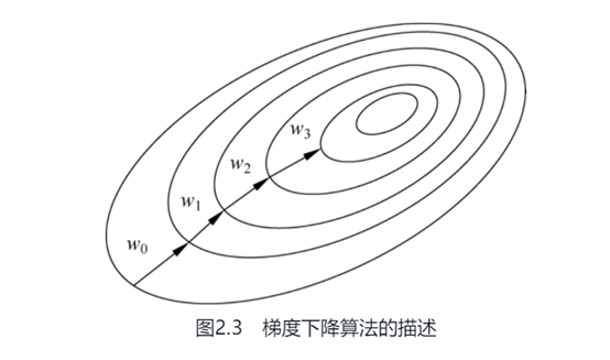 基于此,梯度下降算法的思想包括以下部分。(1)选定一个初始点w0。(2)沿梯度反方向逐步更新参数,即wt=wt-1-α▽J(wt-1)直至收敛。这里α>0,α为步长(Step Size),又称为学习率(Learning Rate),它的值可以在训练之前设为定值,也可以根据训练情况调整。基于梯度的定义,对于足够小的α值,有J(wt)≤J(wt-1)。那么从w0出发,如果给定合适的步长,会逐步得到更小的损失函数J(w0)≥J(w1)≥J(w2)≥…。如果顺利,序列wt将逐渐收敛到损失函数的极小值,这一过程如图2.3所示。