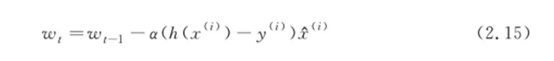 基于梯度▽J(w),可以逐步更新wt,通过wt=wt-1-α▽J(wt-1)得到最优的参数值。梯度下降算法不仅用于线性回归,机器学习中很多问题都可以通过梯度下降算法最小化损失函数来解决。梯度下降算法又称批量梯度下降(Batch Gradient Descent)算法,这里的批量是指用到了所有的训练样本个数m。在实际问题中,往往有相当多的样本数,例如一个学校的学生人数、银行里的客户数目、硬盘里的图片等。尤其对于复杂的学习模型,如深度神经网络,其参数本身就很庞大,如果每次计算梯度都用到所有的数据样本,那么计算量将是相当大的,甚至是不可计算的。事实上可以将该算法想象成一个随机的过程,也就是每次仅随机抽取一个点,在期望上与所有点加起来的平均大体相似。这样就可以用单个点的梯度代替平均的梯度,该单个点的梯度叫随机的梯度,整体的梯度可以看成是随机梯度的期望值。基于随机梯度下降的线性规划问题迭代算法涉及公式如下:
