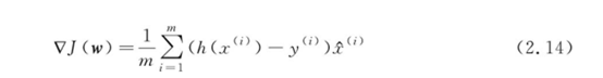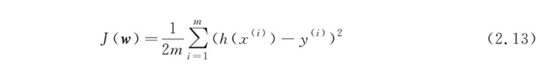 假设损失函数J定义在平面上,并且函数图像类似于一个碗形容器。椭圆形的曲线代表等高线,即函数J为常数的集合构成的曲线,越往中间值越小。任意选择一个初始点w0,箭头指向该点梯度的反方向(梯度方向与该点为等高线垂直),逐步沿着梯度下降方向更新参数w,将最终到达碗底,即函数J的极小值点。2.1节把求解线性回归问题转换为求最小化损失函数J(w)问题,那么就可以用梯度下降算法来求解。对于一组给定的数据集{(x(i),y(i))},根据x的属性个数定义参数w,线性方程h(x(i))与损失函数的关系如下: