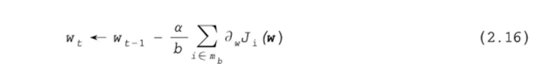 算法2.1概括了小批量梯度下降算法的主要流程,其中mb为从m个样本中随机采样的b个样本的索引集合,Ji(w)为第i个样本上的损失函数。步长的选择、收敛的条件等问题将在以后部分介绍。