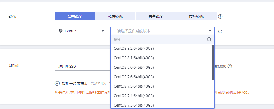 如下图所示是购买ECS的时候在镜像一栏的窗口。我们在此选择Centos,版本选择7.6