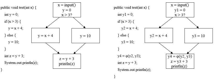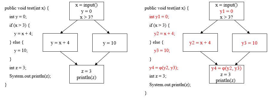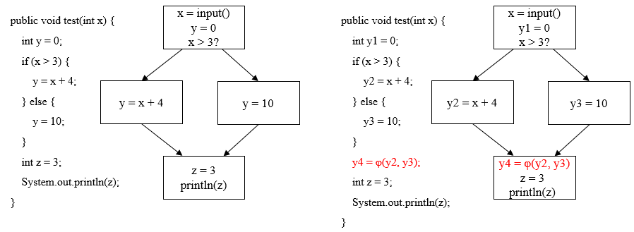 以下图为例,左图是原始代码,里面有分支, y 变量在不同路径中有不同赋值,最后打印 z的值。右图是等价的 SSA 形式,y 变量在两个分支中被改写为 y2, y3,在控制流交汇处插入φ函数,合并了来自不同边的 y2, y3值, 赋给 y4 最后z由y4生成。