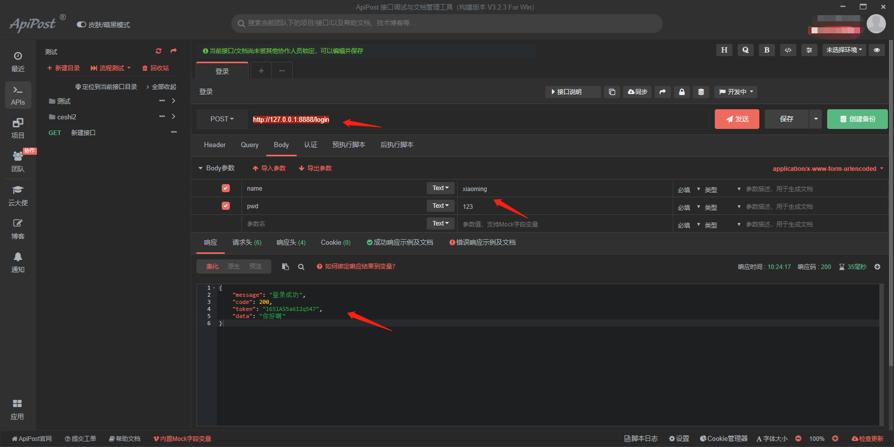 使用工具进行接口测试,这里我用的是国产的接口测试工具apipost,它还支持接口文档的生成。