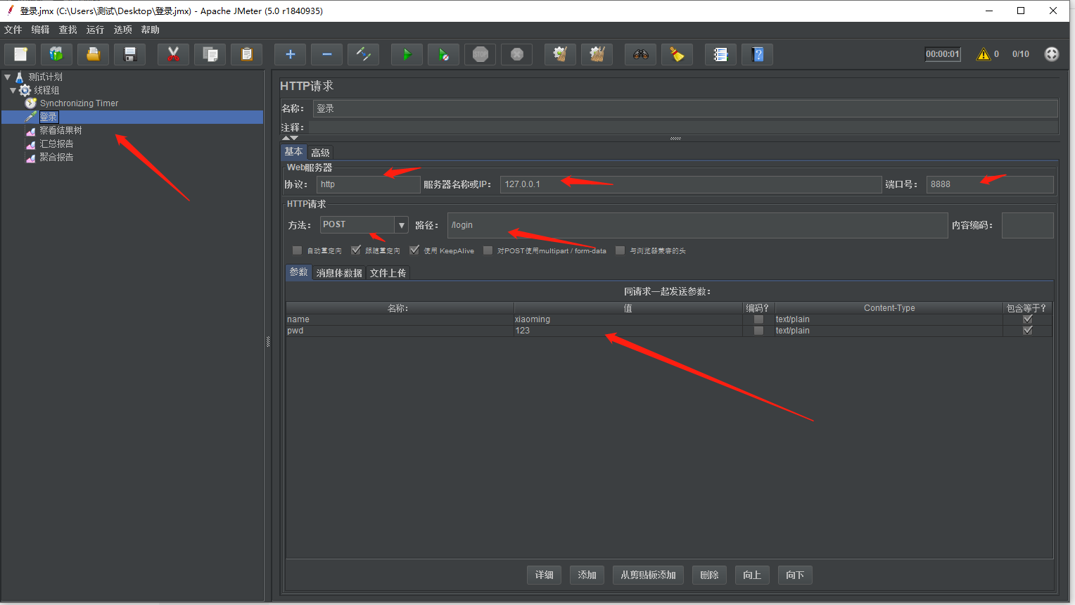 打开jmeter,设置线程组,集合点、请求、查看结果树、汇总报告、聚合报告等,可根据自己的需求进行添加