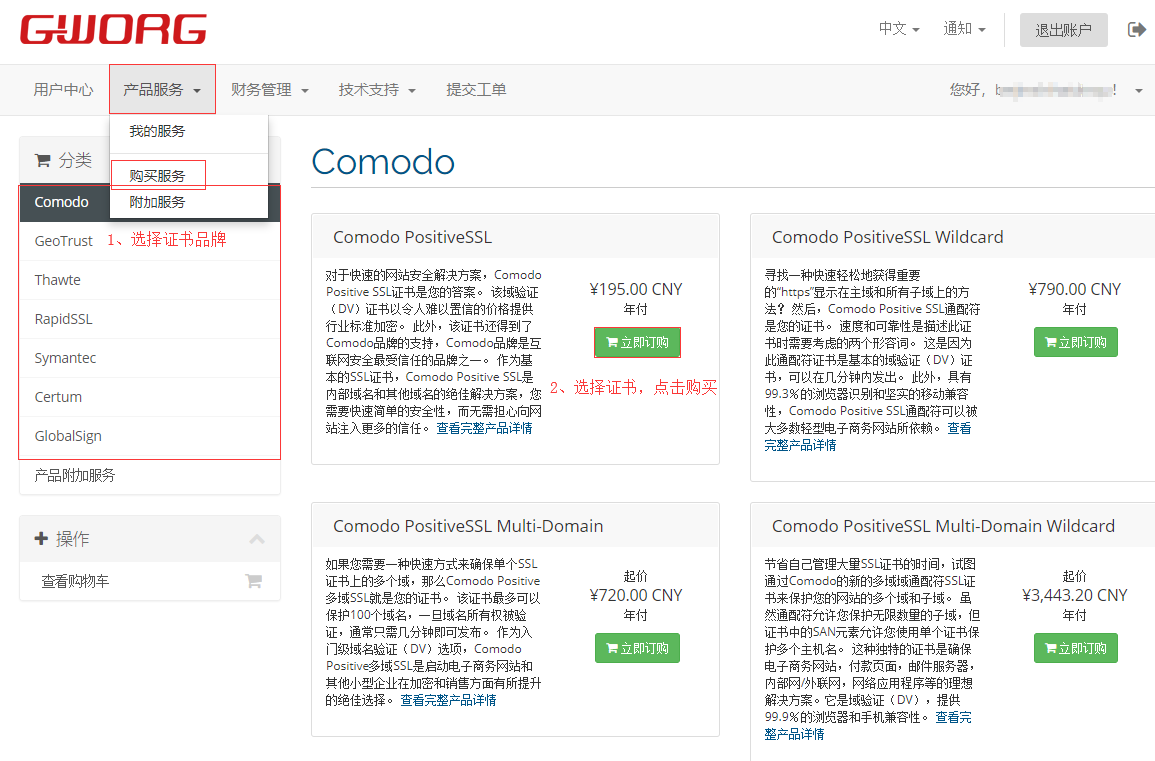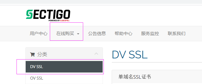 选择购买的证书品牌,然后点击【在线购买】按钮确认需要的产品和证书类型