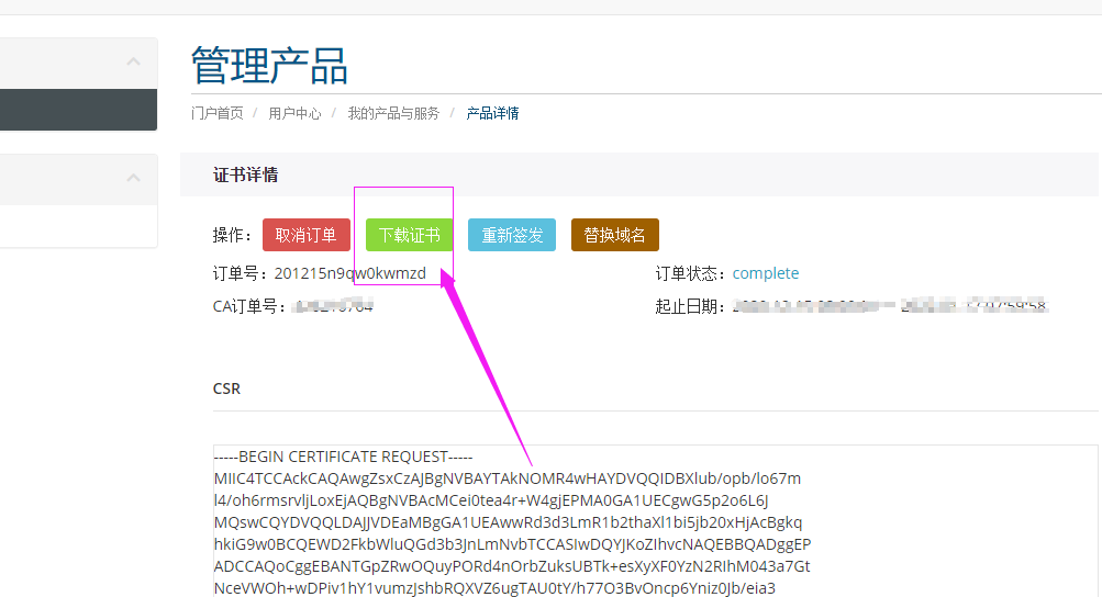 填写域名、选择认证方式,点击生成CSR