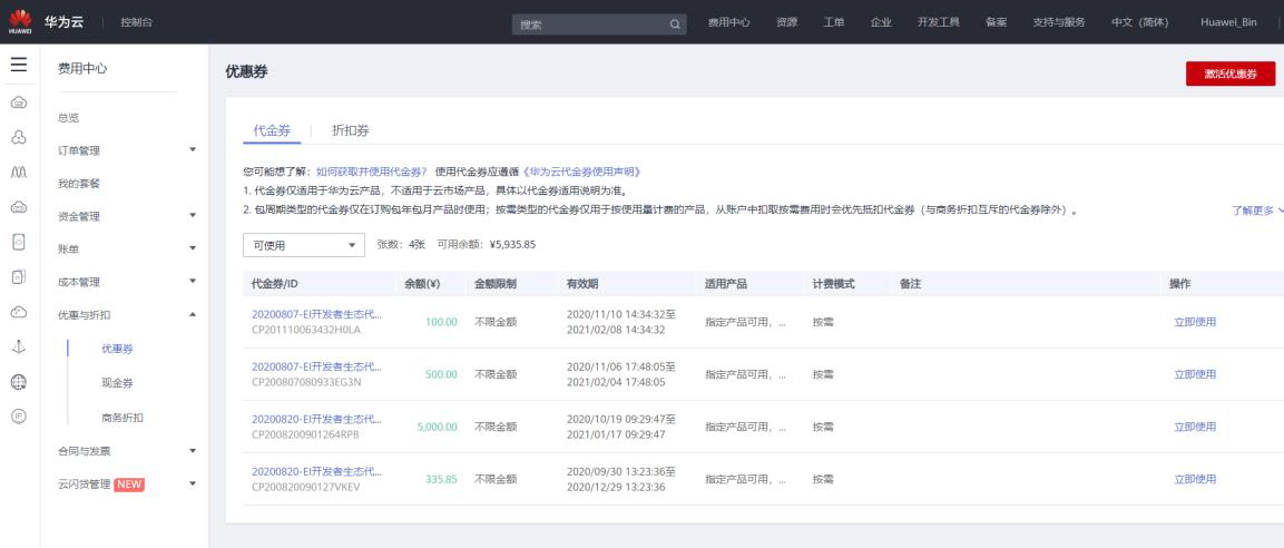 同时在费用中心-》优惠与折扣-》优惠券的地方,检查自己的代金券是否领取成功