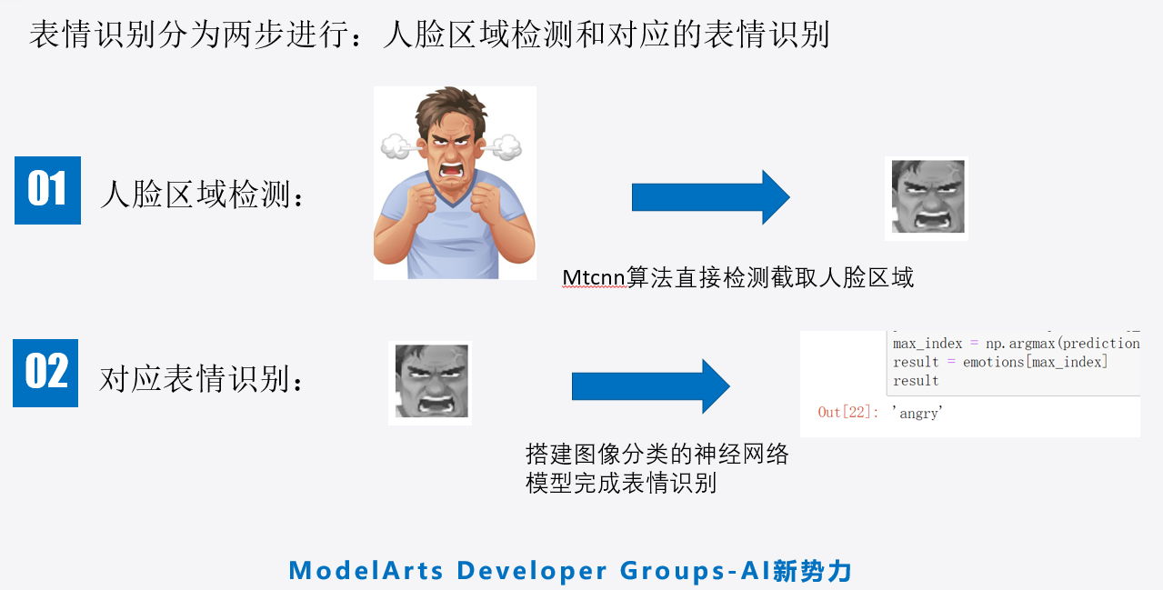 本案例通过深度学习模型识别人脸表情。这里我们使用的数据集为 kaggle2013 年表情识别数据集,共有七种表情。我们先通过人脸识别算法MTCNN检测人脸的区域,然后通过深度学习分类网络判断出人脸的表情。